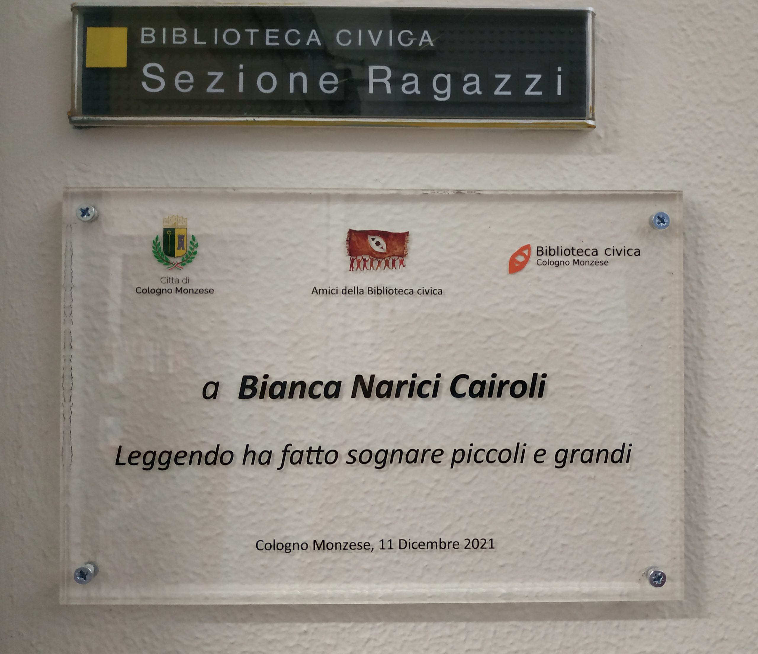 L’Amministrazione Comunale ha deciso di dedicare a Bianca Narici Cairoli, venuta a mancare il 30 gennaio 2021, una targa che è stata apposta in sala ragazzi. L’evento si è svolto sabato 11 dicembre 2021. La storia di Bianca è da sempre intrecciata a quella della biblioteca. Un’indimenticabile e preziosa presenza che ci ha accompagnato nelle diverse stagioni, che la nostra comunità di lettori ha attraversato.